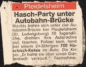 Doch kommen wir zum eigentlichen Thema. Der berühmten Hasch-Party unter der Pleidelsheimer Autobahnbrücke, nahe dem Kreuz Ludwigsburg: Was hat sich dieser junge Mann bloß dabei gedacht? Siebenhundert Hasch-Kekse im Auto – verkauft über einen Gartentisch. Wie kann man sein junges Leben bloß so leichtfertig wegwerfen? Das Leben vieler anderer hoffnungsvoller Menschen am Anfang ihrer Entwicklung beinahe in den Abgrund reissen? Ein Gartentisch! Wie grob fahrlässig! Ein Glück, dass aufmerksame Ordnugshüter [sic-PA] diesem gefährlichen Treiben rechtzeitig ein Ende bereitet haben. Die Folgen sind kaum auszudenken – Immerhin weiß doch jeder, dass aus hygienischen Gründen nach der Pleidelsheimer Gewerbeordnung Haschisch-Kekse ausschließlich über speziell zugelassene Edelstahltische verkauft werden dürfen. Teflonbeschichtet. Damit niemand schlechte Laune bekommt…