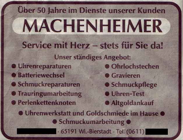 Bierstadt, Heimstadt von Erich Machenheimer und bekannt für die guten Ergebnisse auch in schwierigen Fällen, ist weiterhin berühmt für seine große Berliner-Auswahl. Wo sonst gibt es nicht nur eine ganze Menge normaler Berliner, sondern sogar „beschwipste Berliner“, vermutlich gefüllt mit dem Lieblingsbier des großen Erich Machenheimer. Da kommt richtig Laune auf im Stehcafé, spätestens nach dem dritten Fettgebäck um 10 Uhr morgens. Selbst der größte Biskin-Gourmet kommt im schönen Bierstadt auf seine Kosten. In den Kuchen spritzen darf hier auch der ungelernte Bäckerlehrling [sic-PA] und für den anglophilen Zugezogenen gibt es beinahe korrekt geschriebene Donats [sic-PA]. Wir finden, dass damit alles zu Bierstadt gesagt ist, wünschen unserem lieben Freund im Exil das Allerbeste und beglückwünschen ihn zu seiner Ortswahl. Alles kann, nichts muss – Wenn gut, dann immer weiter! [sic-PA] Süffig! [sic-PA] Gediegen! [sic-PA]