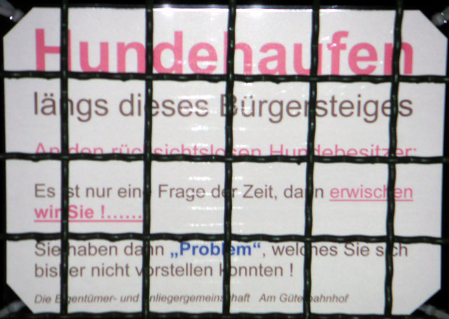 Und diese mächtigen Stammeshäuptlinge haben ein Problem: Das Stoffwechsel-Endprodukt des Canis lupus familiaris. Hundescheisse also. Ein Schild musste her. Und ein Text für das Schild. Und eine handfeste Drohung mit Schmackes. Was wohl dabei herauskommt, wenn die mächtigen Häuptlinge des Stammes der Lützeler (bekannt für ihre Eloquenz im ganzen deutschen Vaterland, wie Bauer Ewald sagen würde), ihr gesamtes Vokabular-Archiv zusammenkehren und loslegen? Sehen Sie selbst und haben Sie: