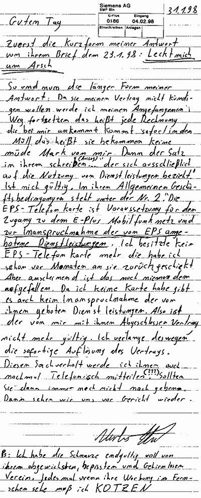 Aber unser junger Mann beginnt seinen Brief direkt mit dieser Kernaussage. Denn er ist sauer und das ist nicht zu übersehen. Möglicherweise ist seine Aufregung berechtigt. Wer kann das aus der Distanz schon sagen. Aber wir sind uns alles andere als sicher, ob die Siemens AG, an die dieser Brief gerichtet zu sein scheint, der richtige Ansprechpartner für ihn ist. Vielmehr besteht wohl ein Problem zwischen ihm und seinem Mobilfunkanbieter. Sollte diese Hypothese stimmen, ist es natürlich nicht weiter verwunderlich, dass seine gesamten Bemühungen – äh, sagen wir – ein wenig fruchtlos bleiben.