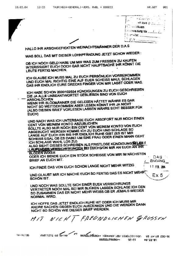 „Ich glaube ich muss mal zu Euch persönlich vorbeikommen und Euch mal richtig eine auf Euer Scheiss Maul schlagen das Ihr endlich Eure Drecks Finger von mir lasst oder was.“