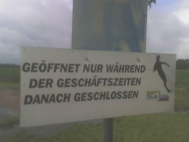 Diese Lösungen hätten allesamt Buchstaben gespart und der (Un-)Sinn wäre trotzdem komplett erhalten geblieben. Wir hassen ineffizientes und unnötiges Rumgeplappere. Außer, wie gesagt, wenn es von uns selbst stammt. Der Verantwortliche für dieses Schild wird daher mit Konsequenzen rechnen müssen. Wegen vorsätzlicher Vergeudung von volkseigenen Buchstaben. Und sowas ist eine Todsünde, die wir mit mindestens 3 Jahren Normkiesabteilung in den Partei-Steinbrüchen der DHIKP ahnden. Bei guter Führung kann das Ganze dann in 2 Jahre Musikantenstadl umgewandelt werden. Wenn wir gute Laune haben. Da könnte ja sonst jeder kommen und 0 Information auf 53 Zeichen verteilen!