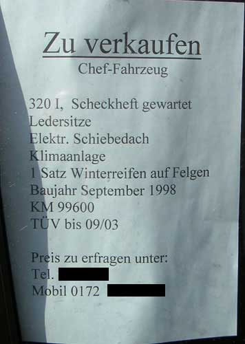 Da wir dieses Dokument des sozialen Scheiterns selbst aufgenommen haben, können wir Euch noch die Zusatzinformation liefern, dass besagtes Auto ein 3er BMW Kombi war. Es spricht also einiges dafür, dass der Verkäufer dieser Aufsteigerschleuder Chef eines Import-Export Unternehmens für gebrauchte Mobiltelefone ist.