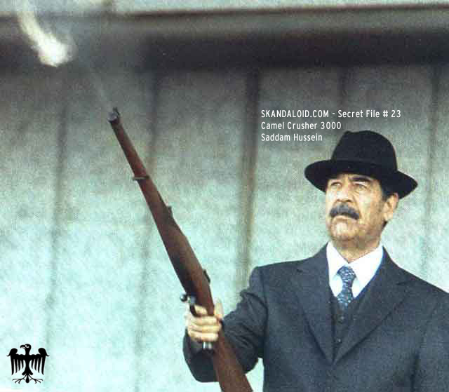 Tatsache ist – Onkel Saddam verfügte neben seinen rotbefleckten Scud-Raketen [sic-PA] wirklich über weitere Massenvernichtungswaffen. Genau, wie unsere amerikanischen Freunde aus Amerikanien immer behauptet haben. Wir haben ja nie daran geglaubt, dass uns unsere Gönner, die den Marshallplan brachten, belügen könnten. Und wie immer gibt uns der weitere Geschichtsverlauf Recht. Im dunklen Reich des skandaloiden Lieblingsdiktators („Meine Schuhe sind mehr wert als Deine ganze Familie“) gab es eine Smoking Gun. Im wahrsten Sinne des Wortes sogar. Wir reden von Saddams Geheimwaffe Nummer Eins: Der Camel Crusher 3000. Eine Büchse wie eine Naturkatastrophe. 1 Schuß pro Stunde, 1.000.000 Millionen Opfer pro Treffer. Da musste auch Präsident Bonzo neidlos anerkennen: Die Tante aus Bagdad hat eindeutig die stärkeren Argumente! Wo diese Wunderwaffe hergestellt wurde? Der Tod ist ein Geselle aus Deutschland, das wissen wir doch alle.