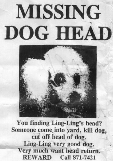 Du finden Ling-Lings Kopf? Kommen jemand in Hof, töten Hund, schneiden ab Kopf von Hund! Ling-Ling immer gewesen gut Hund! Gerne gerne wieder möchten haben Kopf!