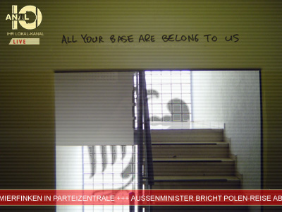 Kaum ist unser Aussenminister mal auf Dienstreise in Polen (Visa unter die Leute bringen und 20 Mark-Scheine an Mädchen verteilen, die gerade zur Schule gehen wollen), schon kommen jugendliche Schmierfinken ohne Sinn für Recht, Anstand und Ostergefühle daher und beschmieren den heiligen Paternoster des Don Denunzio. Aber in ihrer Wortwahl liegt bemerkenswerter Style und Bewußtsein für Old-School Nullphrasen. Ist klar – Den Sinn dieses Beitrags verstehen jetzt wieder mal nur wenige Menschen da draussen. Macht aber nichts. Hauptsache, uns geht’s gut… ;)